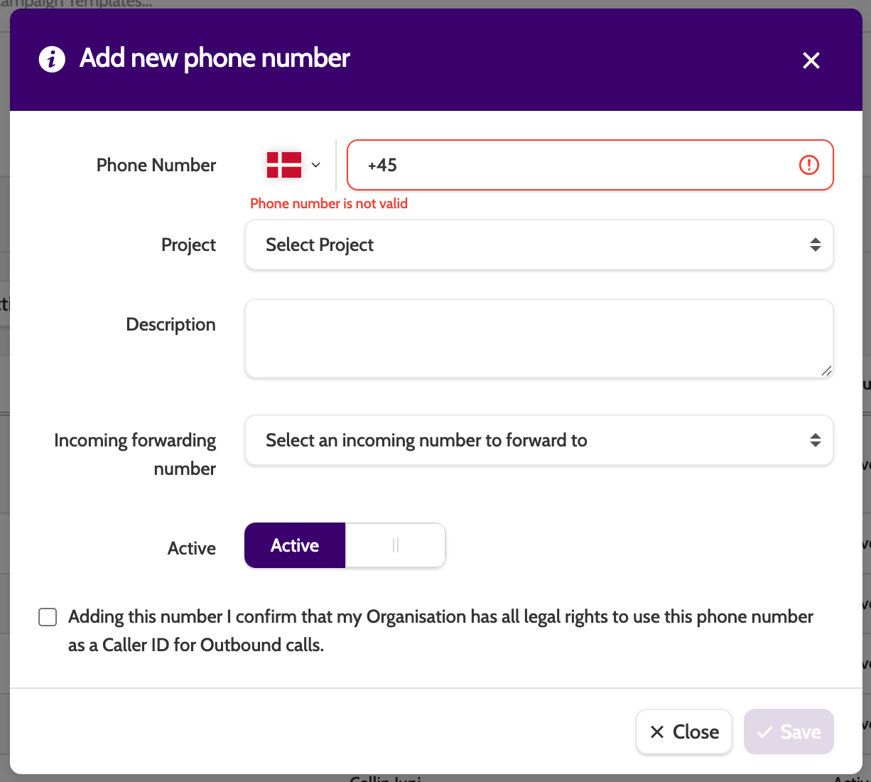 - Project: select which project the phone number will belong to. A phone number can only belong to one project