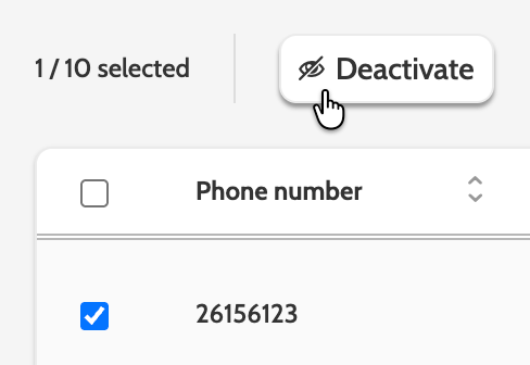 Numbers can be deactivated individually or in bulk by checking and clicking Deactivate.