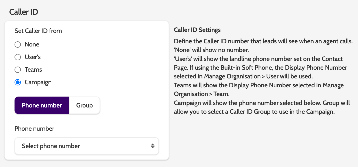 If you select Campaign and Phone number, the phone number you choose will be displayed as the caller ID to each lead called from this campaign.