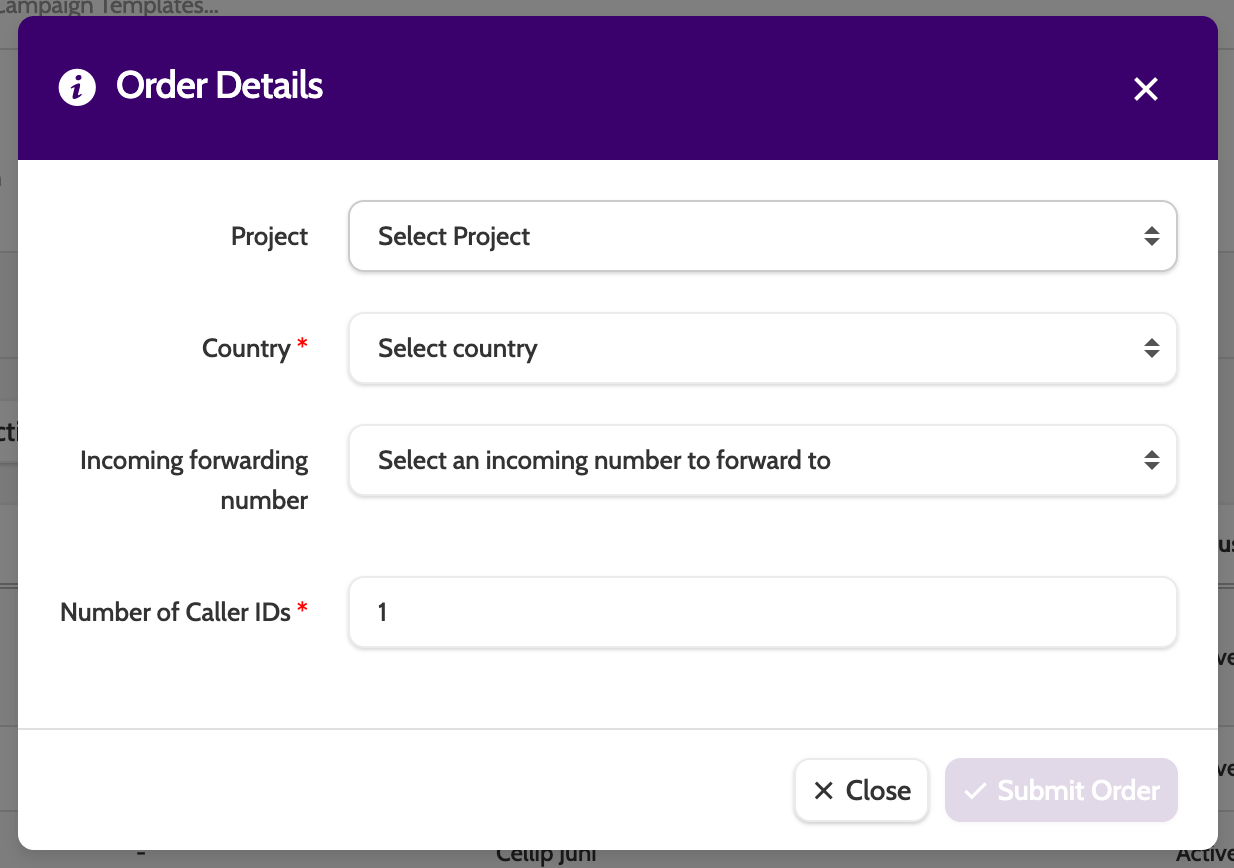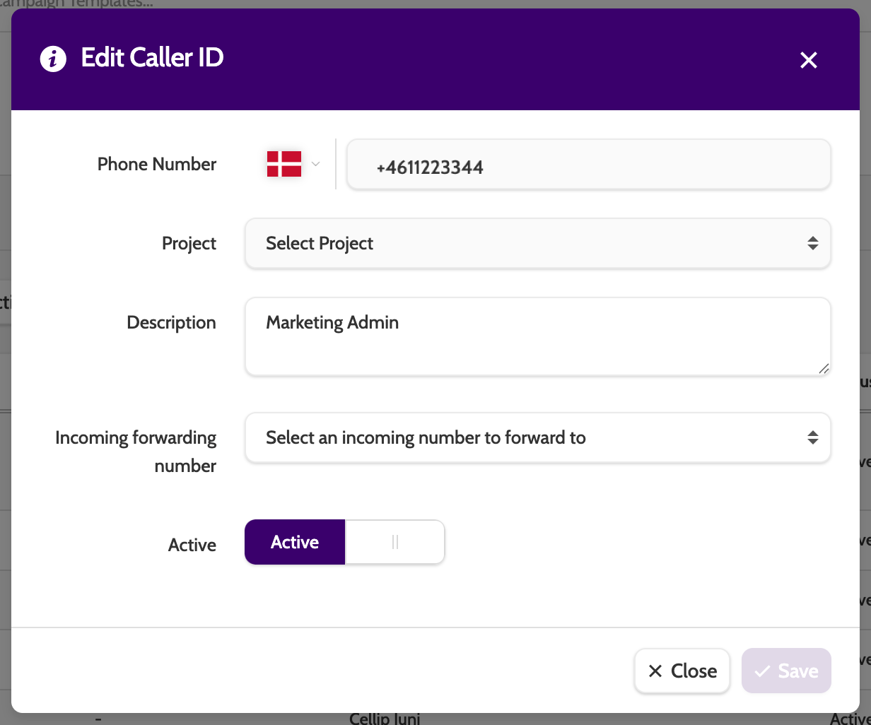 - Project: when selected, the Caller ID can only be used in Campaigns that belong to the Project. Not mandatory