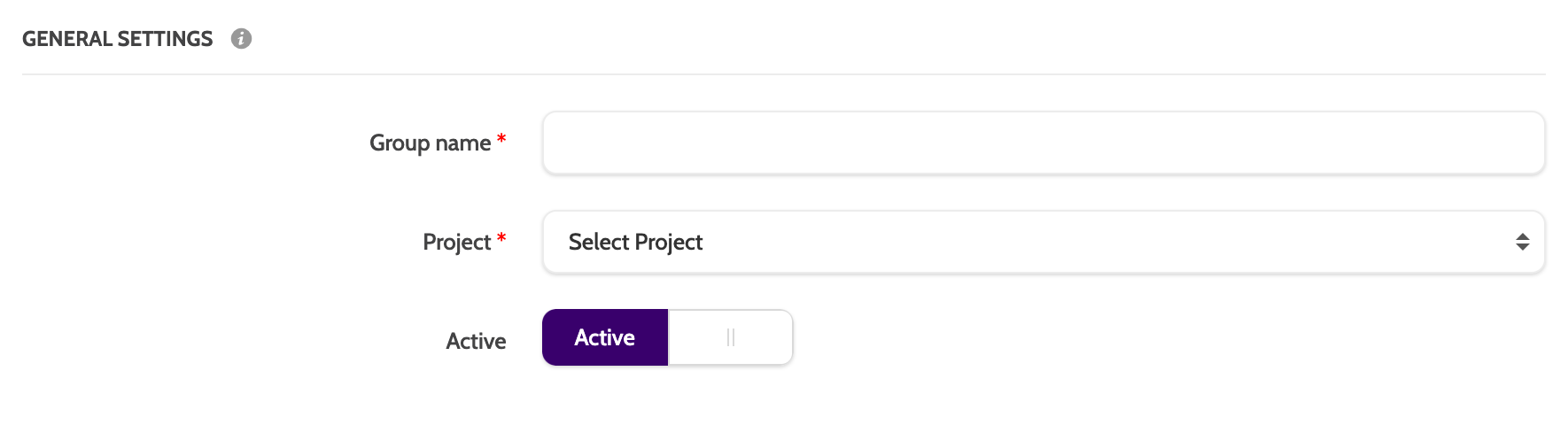 Under General settings, enter a Group name, and select a project from the drop-down menu the group will belong to.