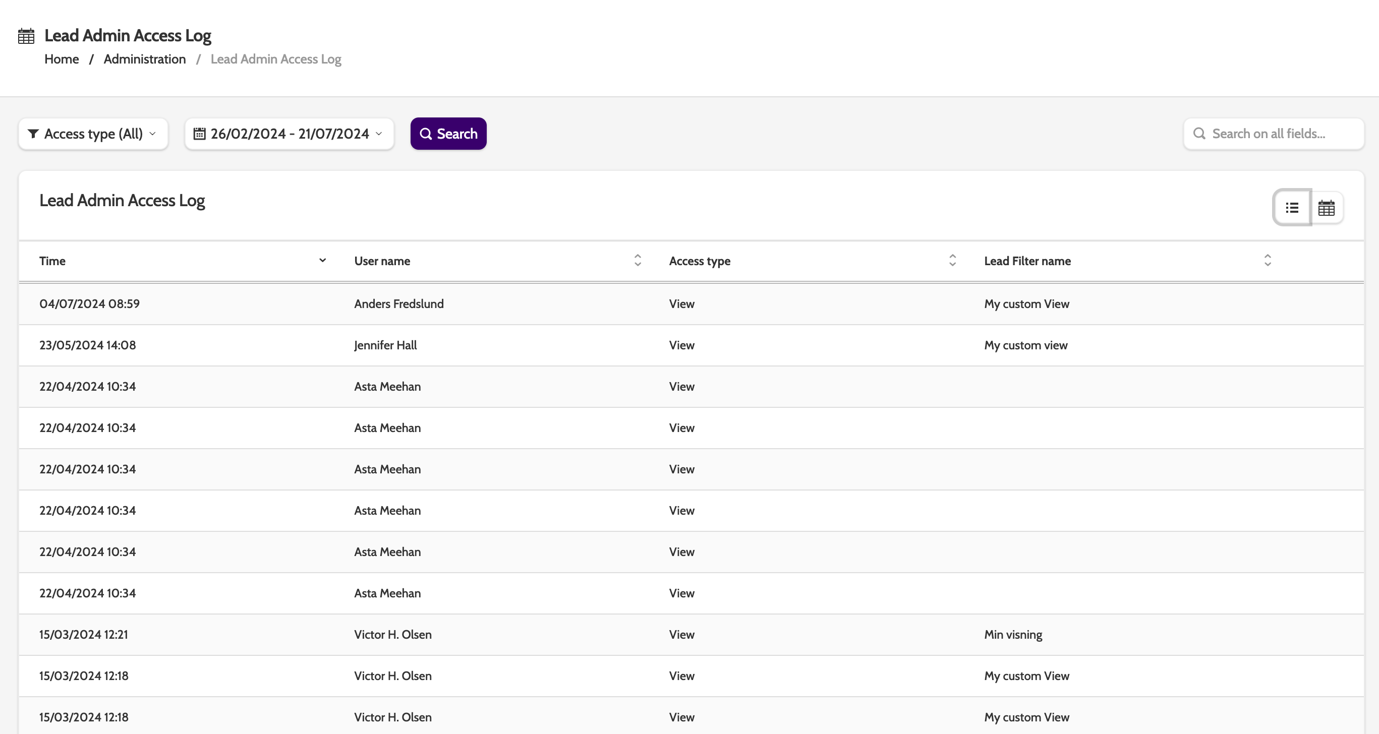 In the navigation page, you will see a list of all access attempts to lead admin, along with TimeUser name, Access Type, and the Lead View Name