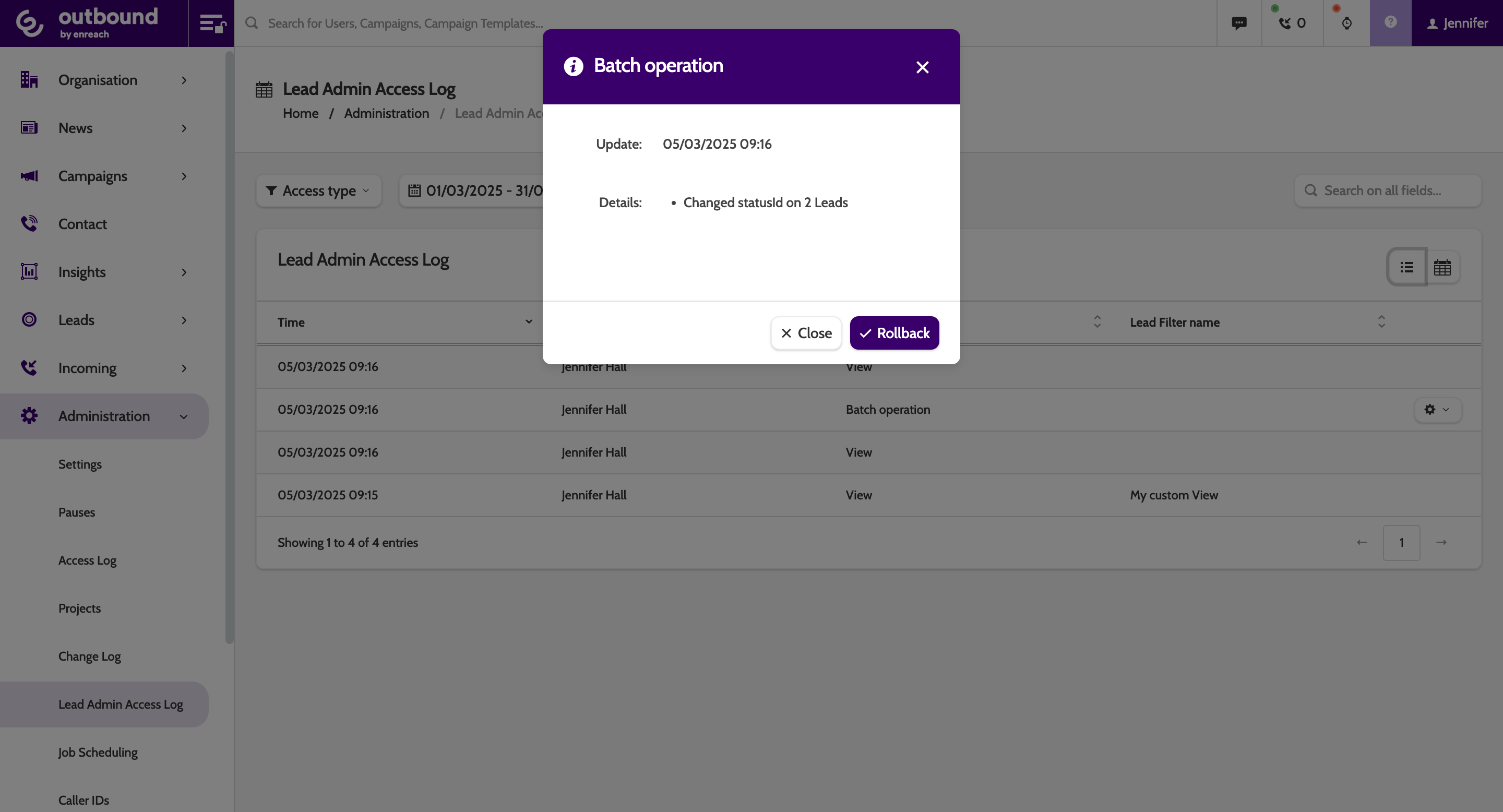 If you are an admin user, use Lead Admin Access Log to view all visits and changes to lead admin (old) in Outbound.