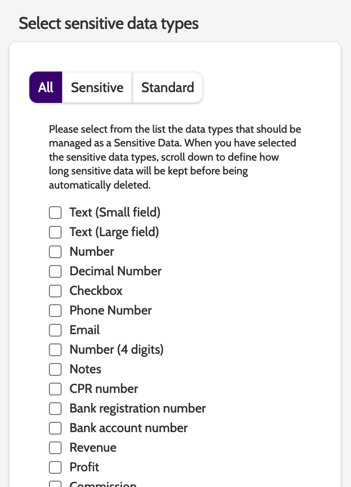 Switch to the Sensitive tab to view all the data types already set to sensitive, and to the Standard tab to view data types that aren't subject to deletion rules.