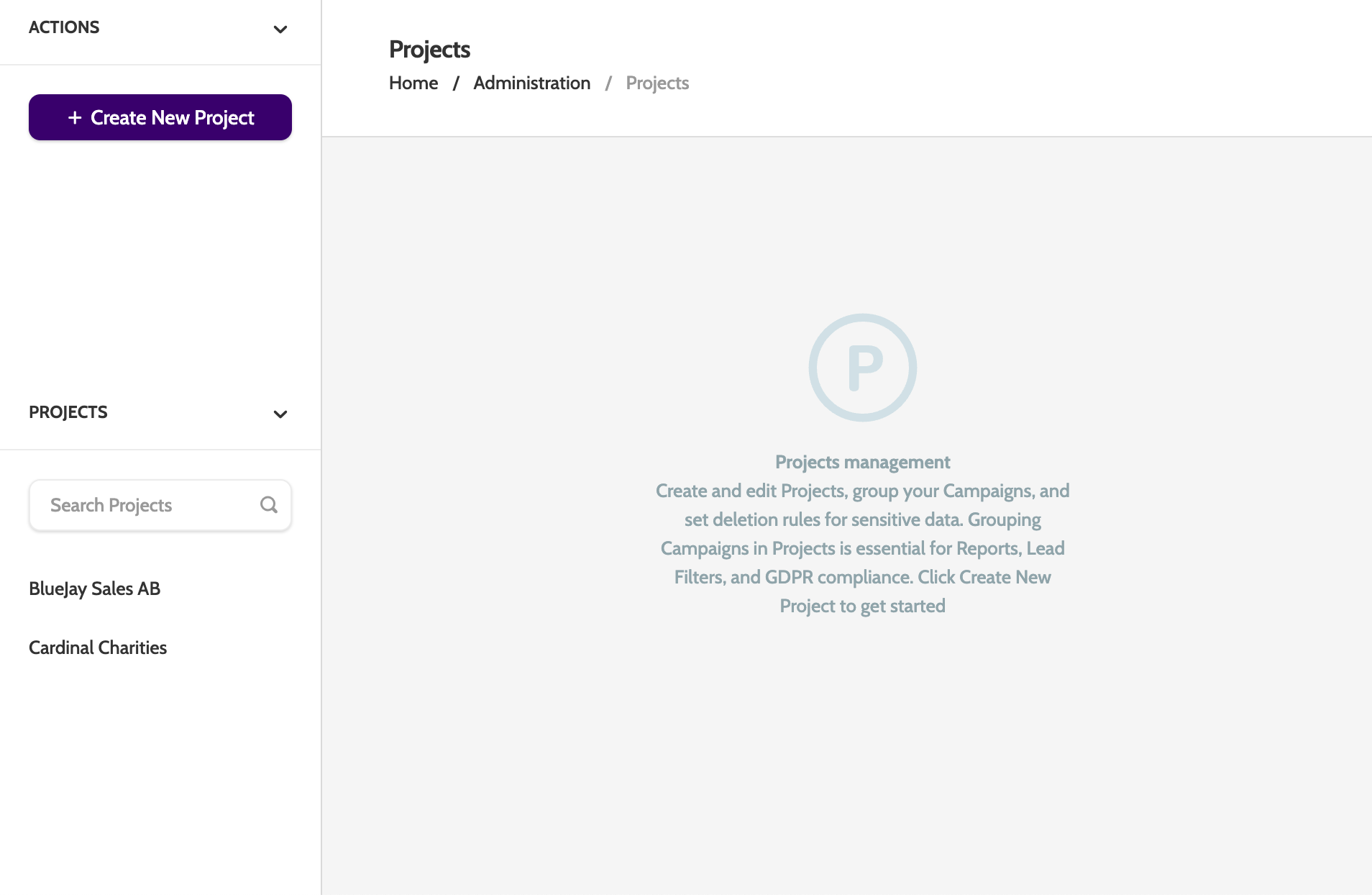 As an admin, you will be able to create a new project whenever you receive a new client or assignment. Deletion rules are also set within projects.