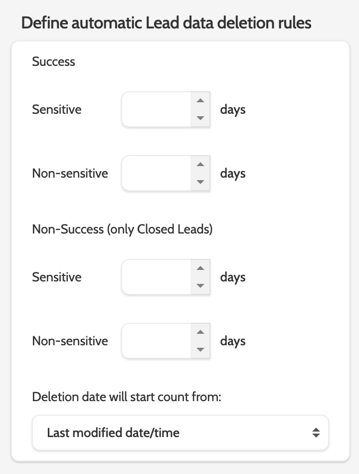 Sensitive data will be deleted after a set period of time, configured below under Define automatic Lead data deletion rules.
