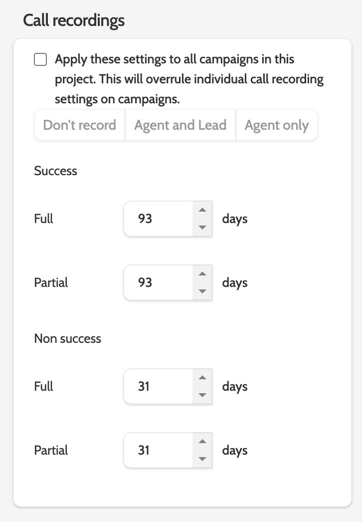 πŸ‘‰ If number of days for storing call recording in campaign settings is lower than in projects, then campaign settings will overrule project settings.