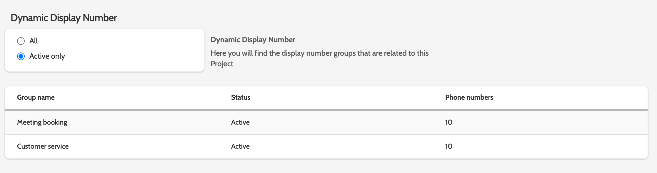 Under Dynamic Display Number, you can view which groups of dynamic display numbers to use in campaigns.