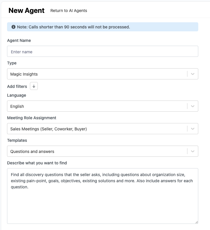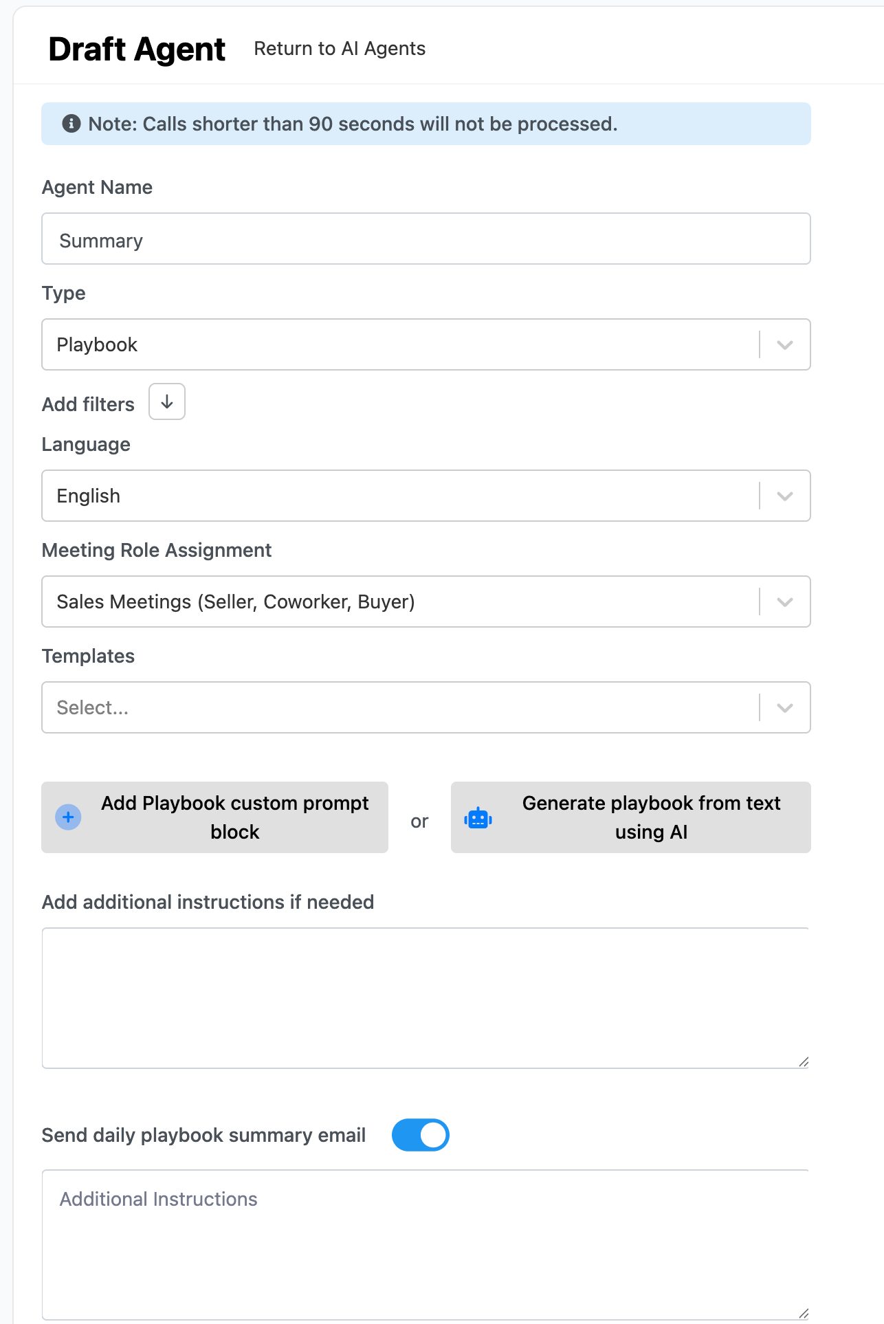 - Under Templates, direct your AI Agent in the right direction with what you want it to focus on. Select from Competitors Mentioned, Closing Attempts, or Questions and Answers