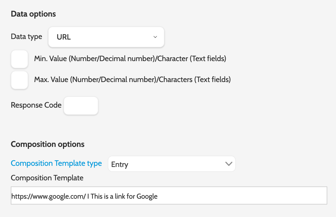 Under Composition options, you can configure two kinds of data fields: Entry and Formula.