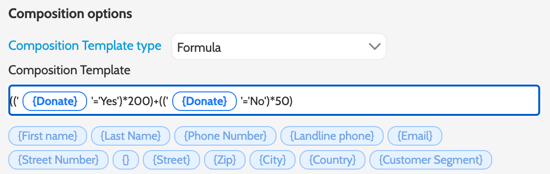 • Enter the following formula in the Composition Template field: (('{Donate}'='Yes')*200)+(('{Donate}'='No')*50)