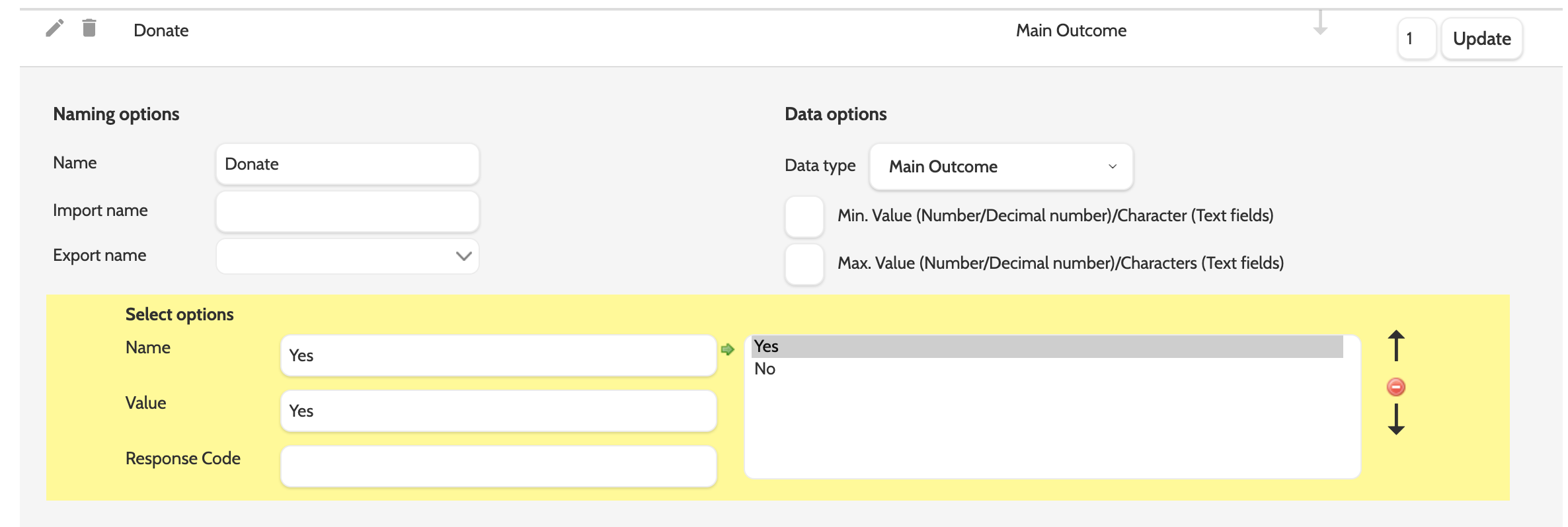 In the Donate field below, there are two answers for the Main Outcome Picklist - Yes and No