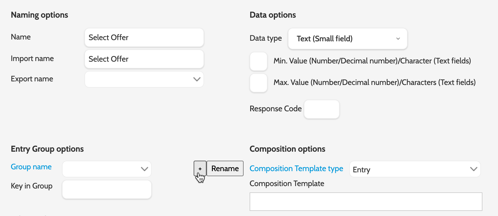 Remember, when you have entered the data field name in the Name field, select the entry group from the Group name dropdown menu, and enter the .xlsx column name in the Key in Group field. Take a look below: