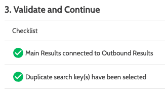 Before you continue, you will notice that all options are validated with a green tick, except Main Outcome has not been selected.