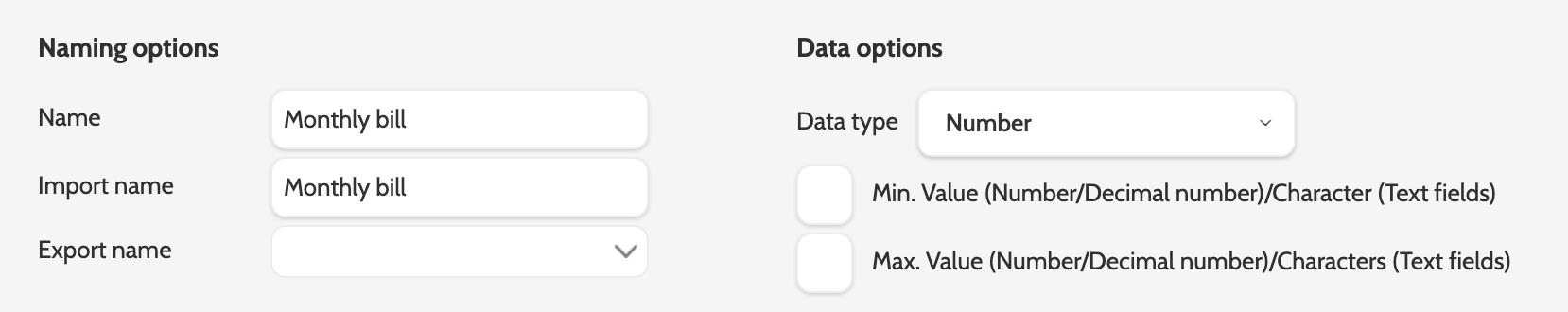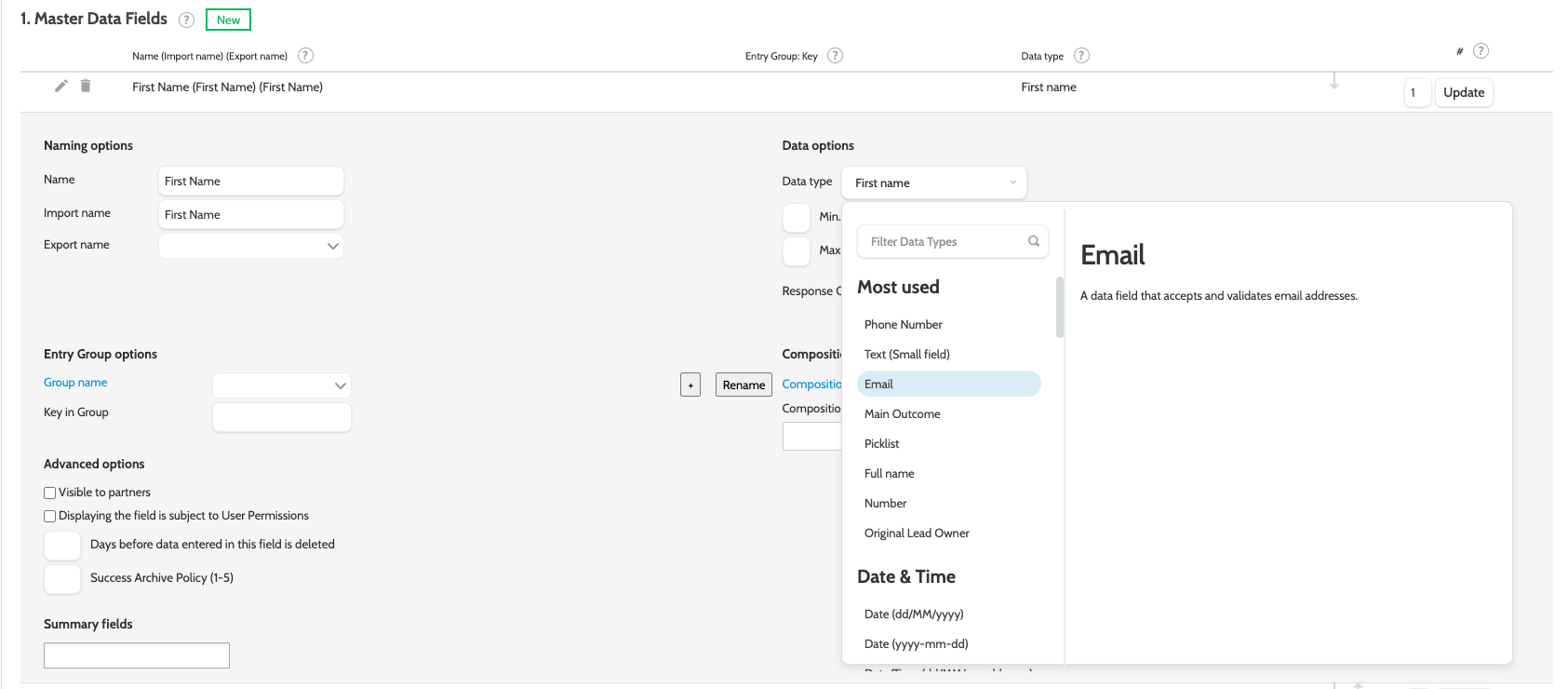 Under Data options, expand the data type drop-down menu and select the data type that matches your master data field.