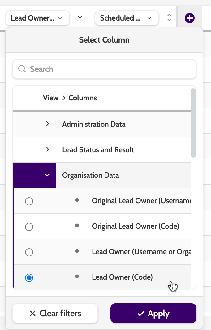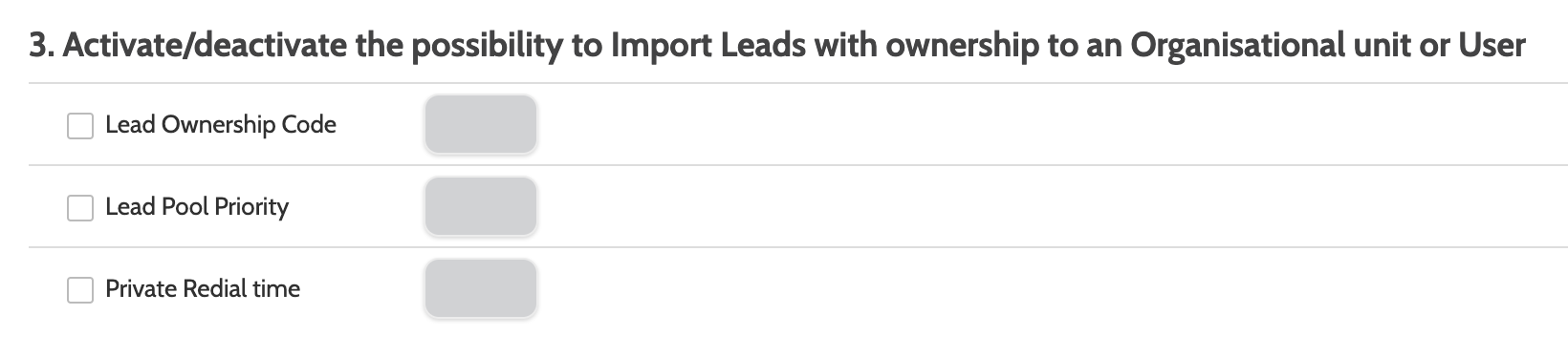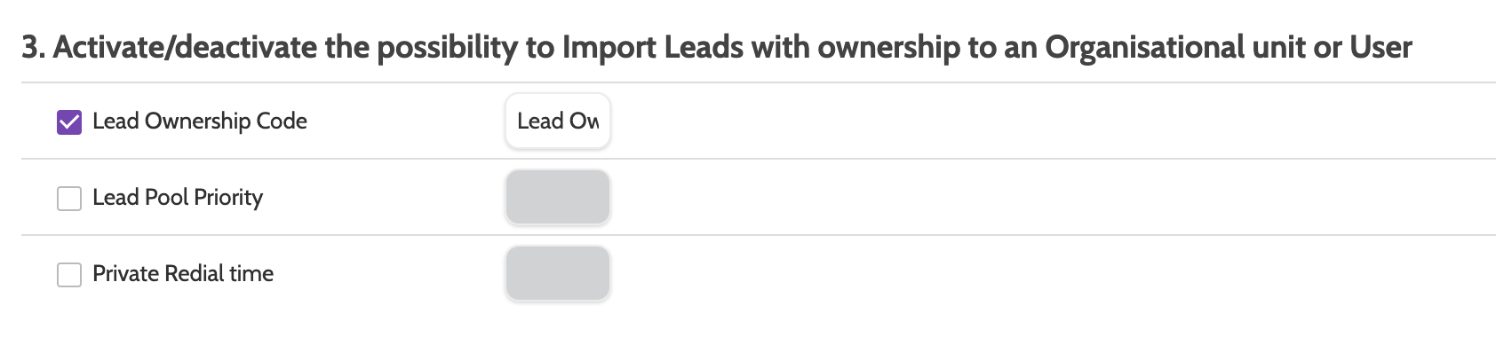 For example, if you want to upload leads with an owner, tick Lead Ownership Code and enter the code or title of the CSV column that will contain the owner.