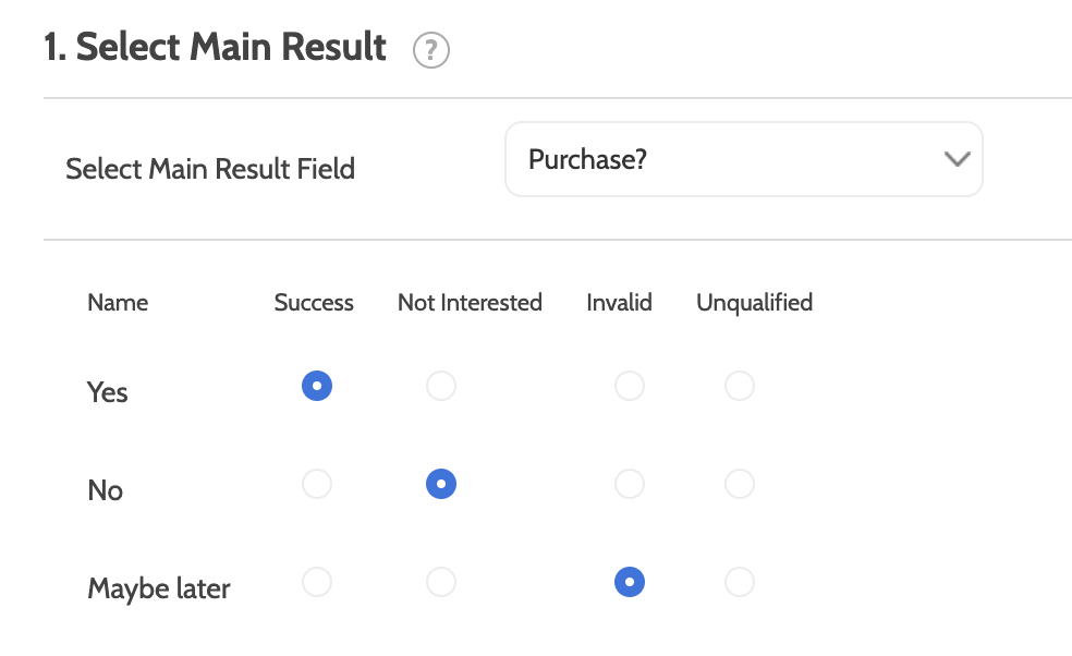 Under Select Main Result, match the answers configured in the Main Outcome Picklist to the selections by selecting the question from the drop-down menu.