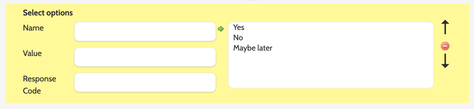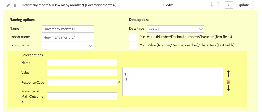 Under Select Options, enter the main outcomes in the Name and the Value in the text boxes.