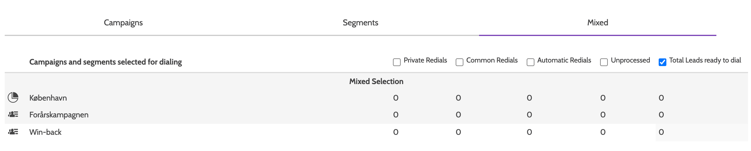 If you've selected Total leads ready to dial, lead selection will follow standard dialer priority rules. Please note that you can't dial campaigns with predictive dialer enabled when using mixed.