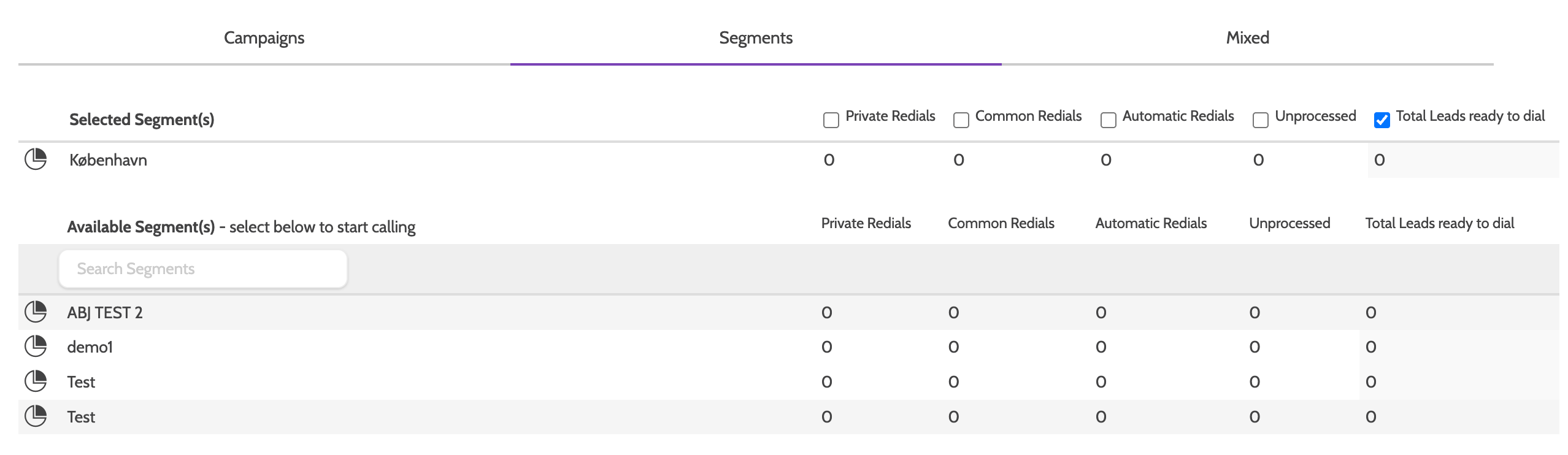 To call from a mix, first select the campaigns to dial from, then the segments: the mix will be available for dialing after switching to the Mixed tab.