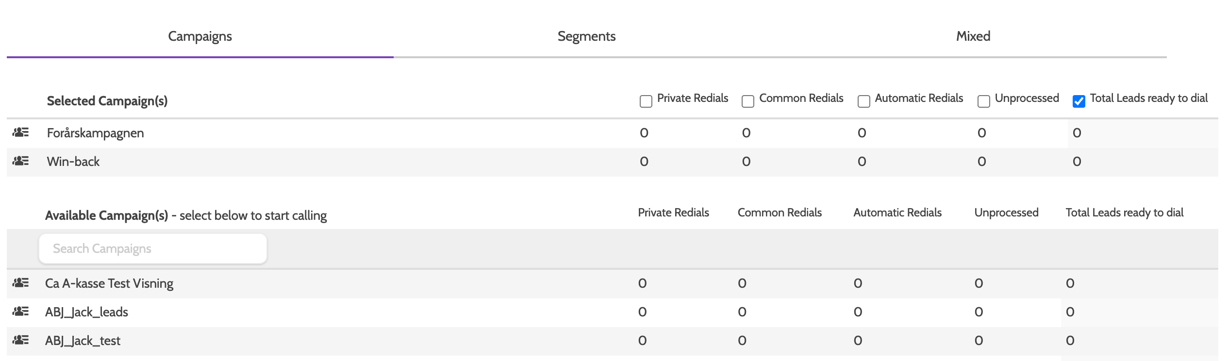 To the right you can view the number of Private Redials, Common Redials, Unprocessed Leads (not contacted), and Total Leads ready to dial in each campaign.