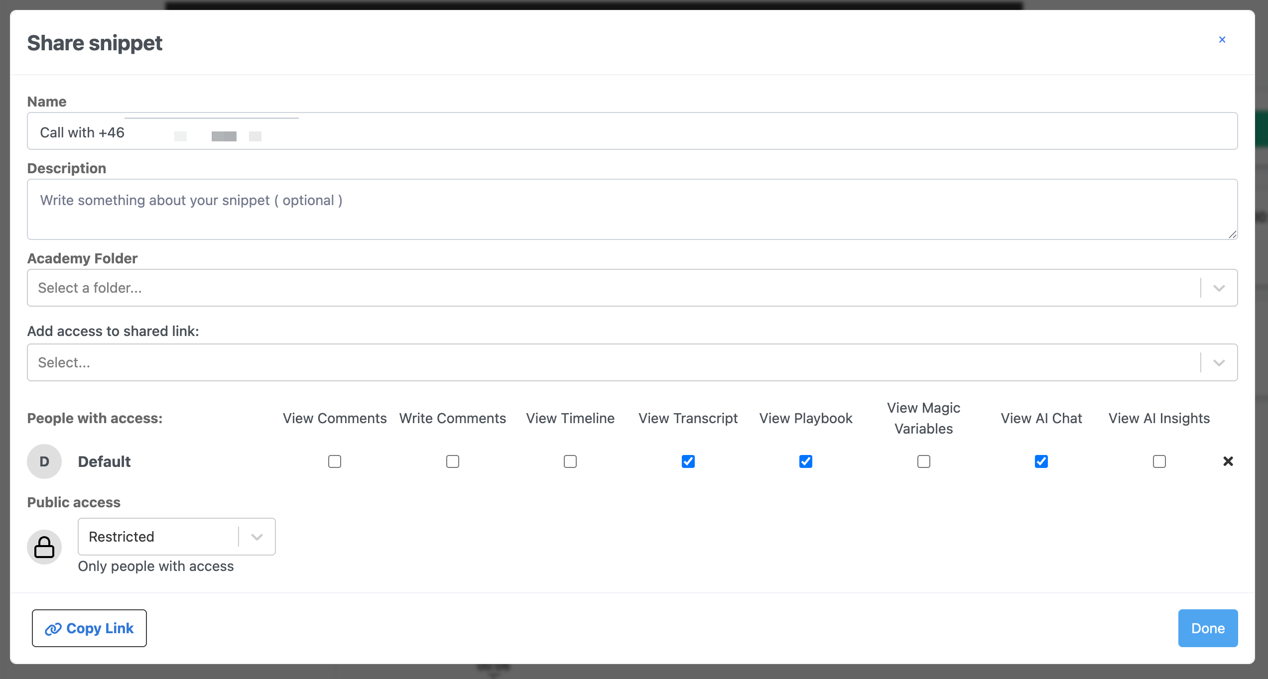 • Add access to shared link: if you want to share the snippet, grant access rights to the recipient by checking the boxes