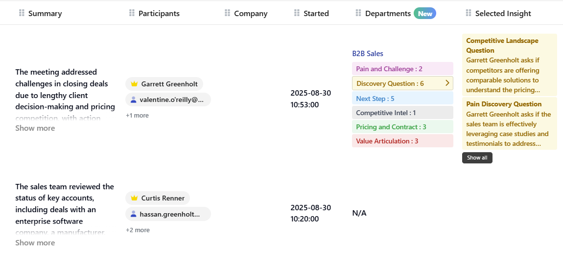 • Use meeting categories (e.g., “Customer insights”, “Product discovery”, “Sales – Demo”) so notes become a lightweight knowledge base that people can search later.