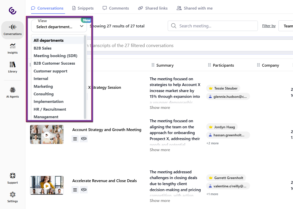 2 - The default view shows all conversations in the most recent order. Click View to choose from pre-defined departments such as B2B Sales, Marketing, and Customer Success, and only view conversations that have been automatically matched to that department