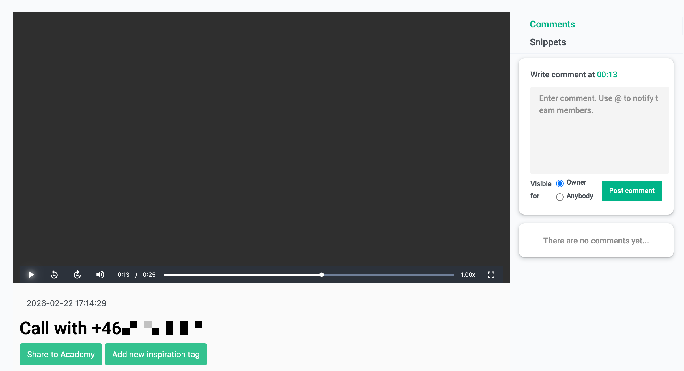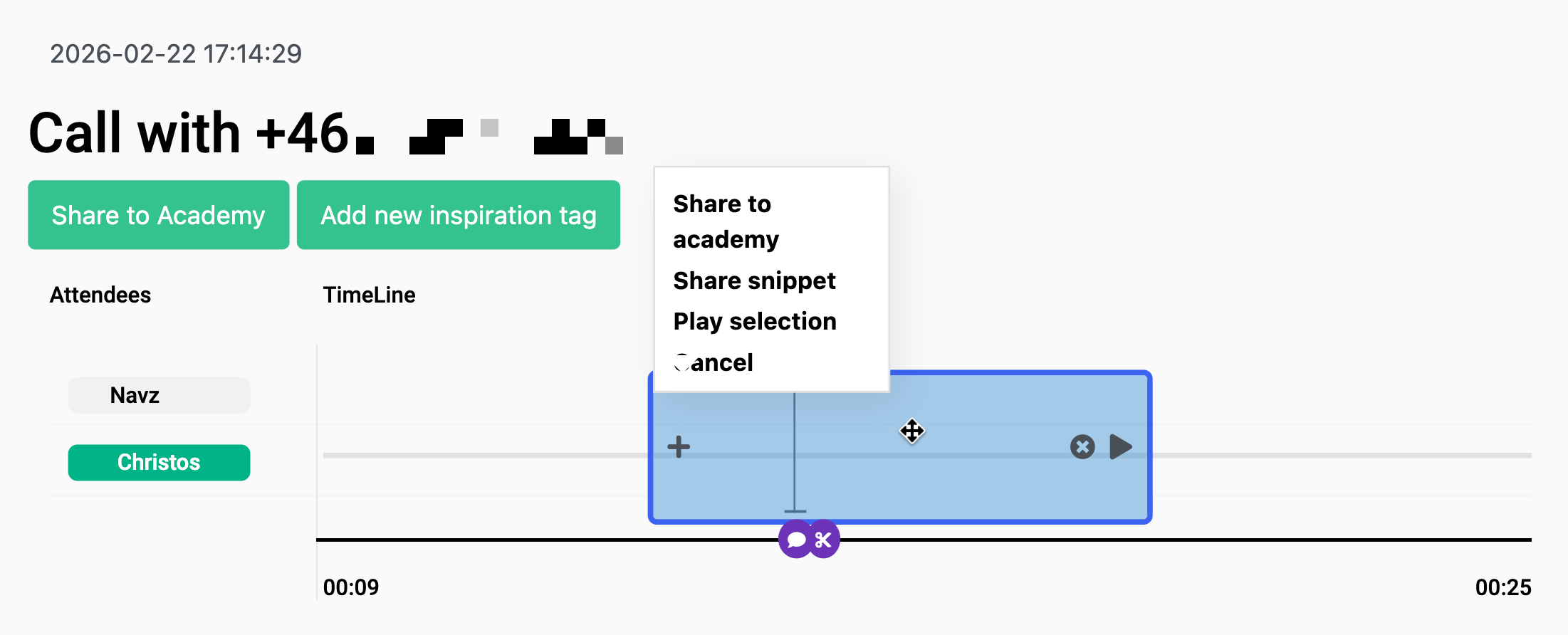 Snippets are customisable snapshots of your conversations that you can save and use for turning important moments (objections, great pitches, customer quotes, coaching moments) into shareable, reusable clips for training and reviews.