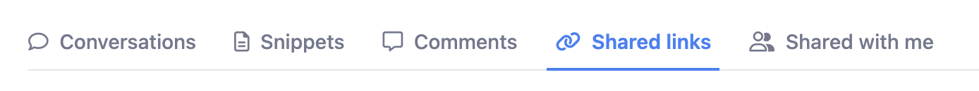 The Conversations page is comprised of several different tabs that you can select to switch between Conversations, Snippets, Comments, Shared links, and Shared with me.
