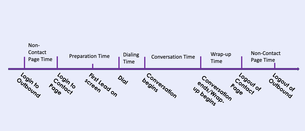 • Preparation time - Dialing time - Conversation time - Wrap-up time.