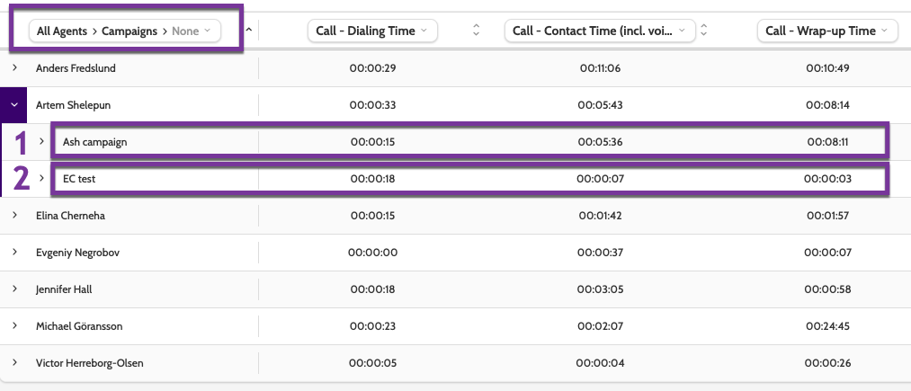 By unfolding the agent's name, you can see the KPIs for the campaigns they have worked in within the chosen time frame.