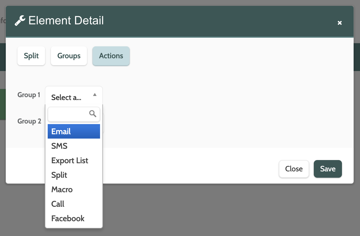 Toggle to Actions in the top menu to configure what actions should be triggered based on whether each group meets the conditions specified. The Action element will then be added to the canvas.