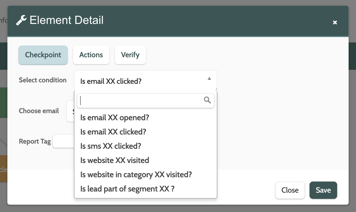The Checkpoint element will allow you to check for a lead's interactions with your communications or website before allowing them to progress in the automation flow.