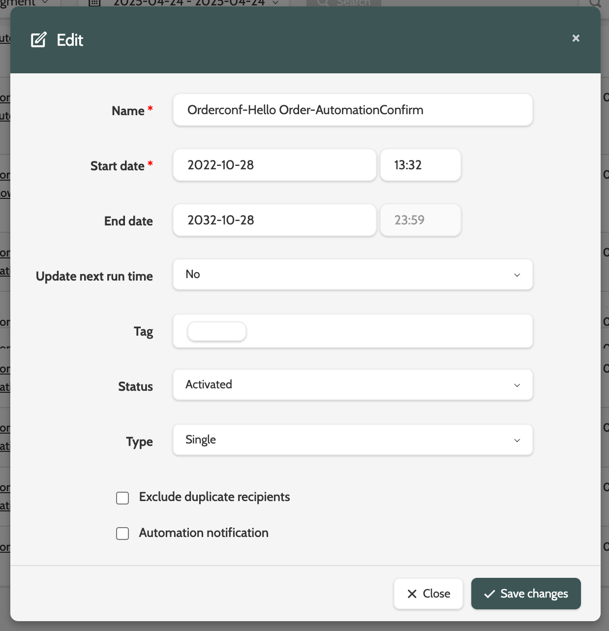 Click Edit setting to adjust the settings of your automation, including start and end dates, status, and duplicate rules.