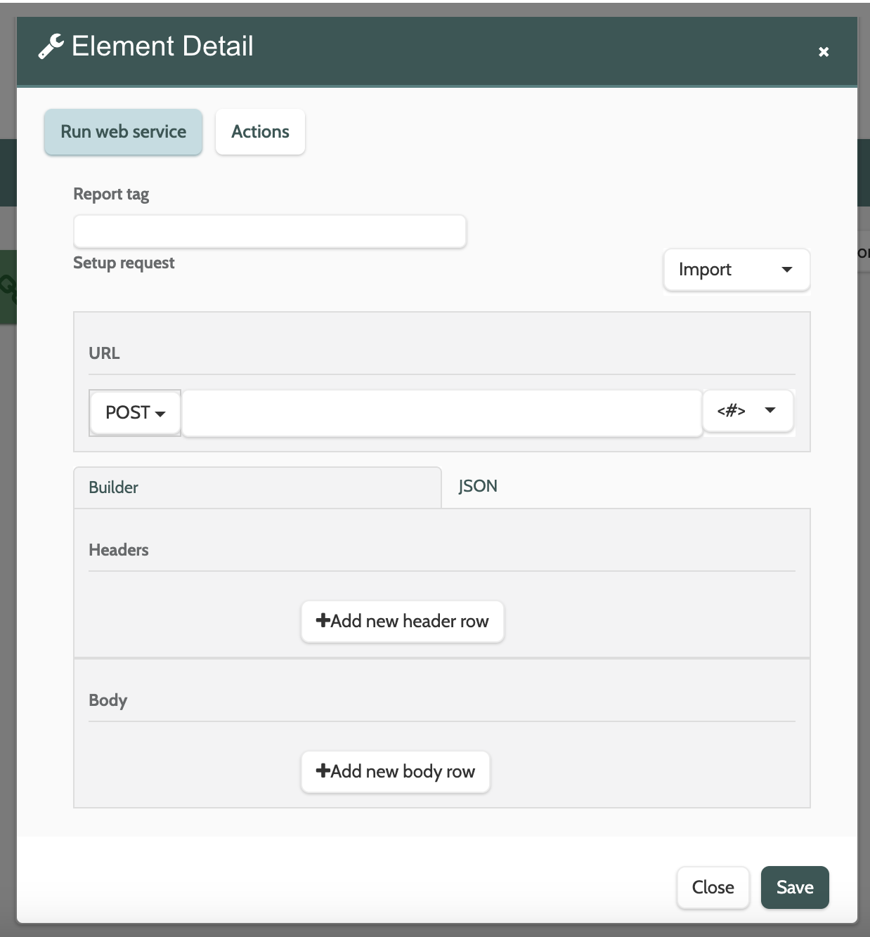 - Builder: if you are using the builder, click Add new header row or Add new body row to begin building your request. Enter the Key and Value in the correct fields, and repeat as necessary