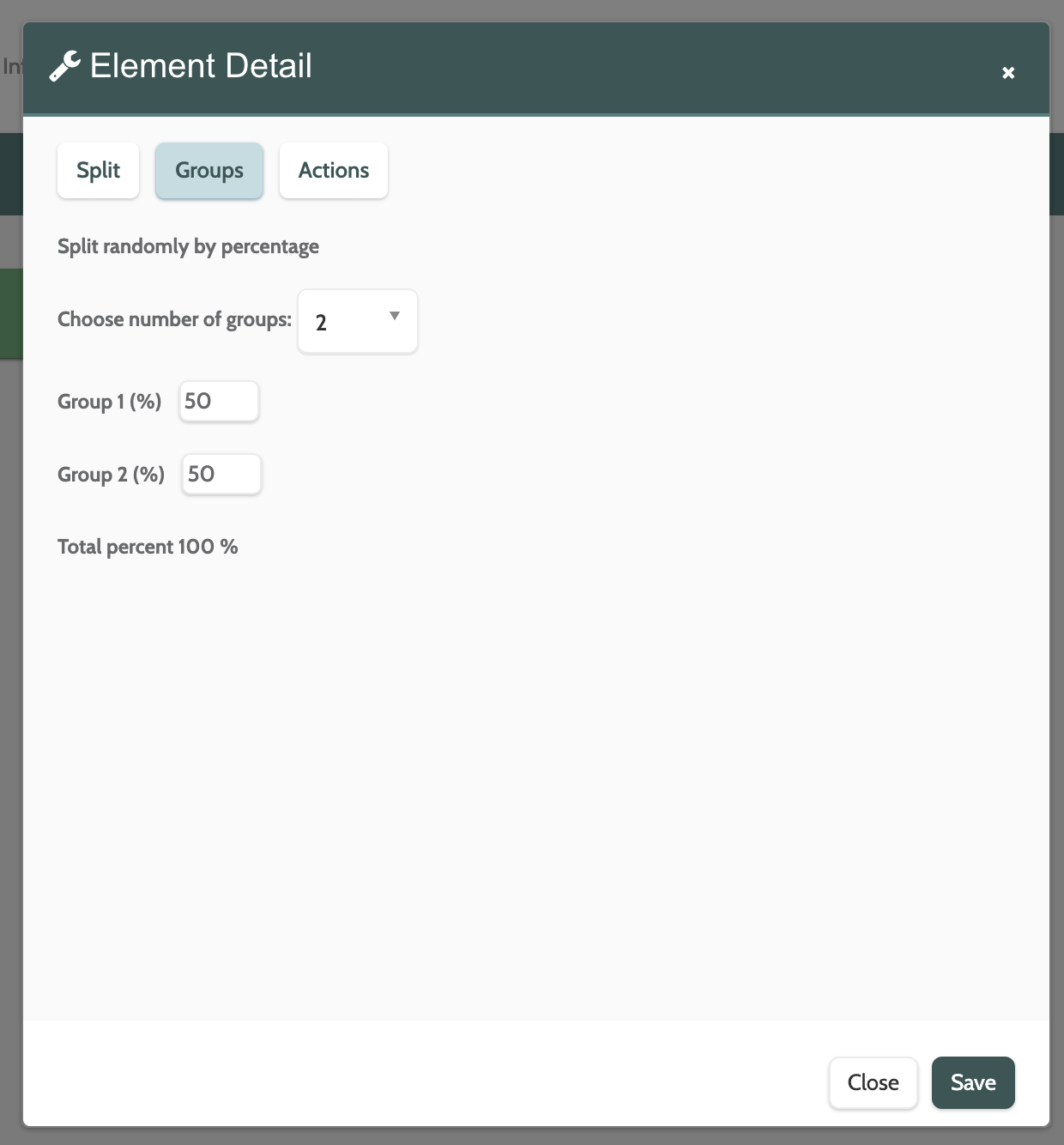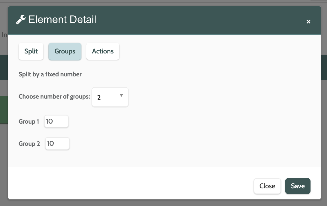 Toggle to Groups to configure how the split will work, depending on whether you chose Random by percentage, Fixed number, or Condition based.