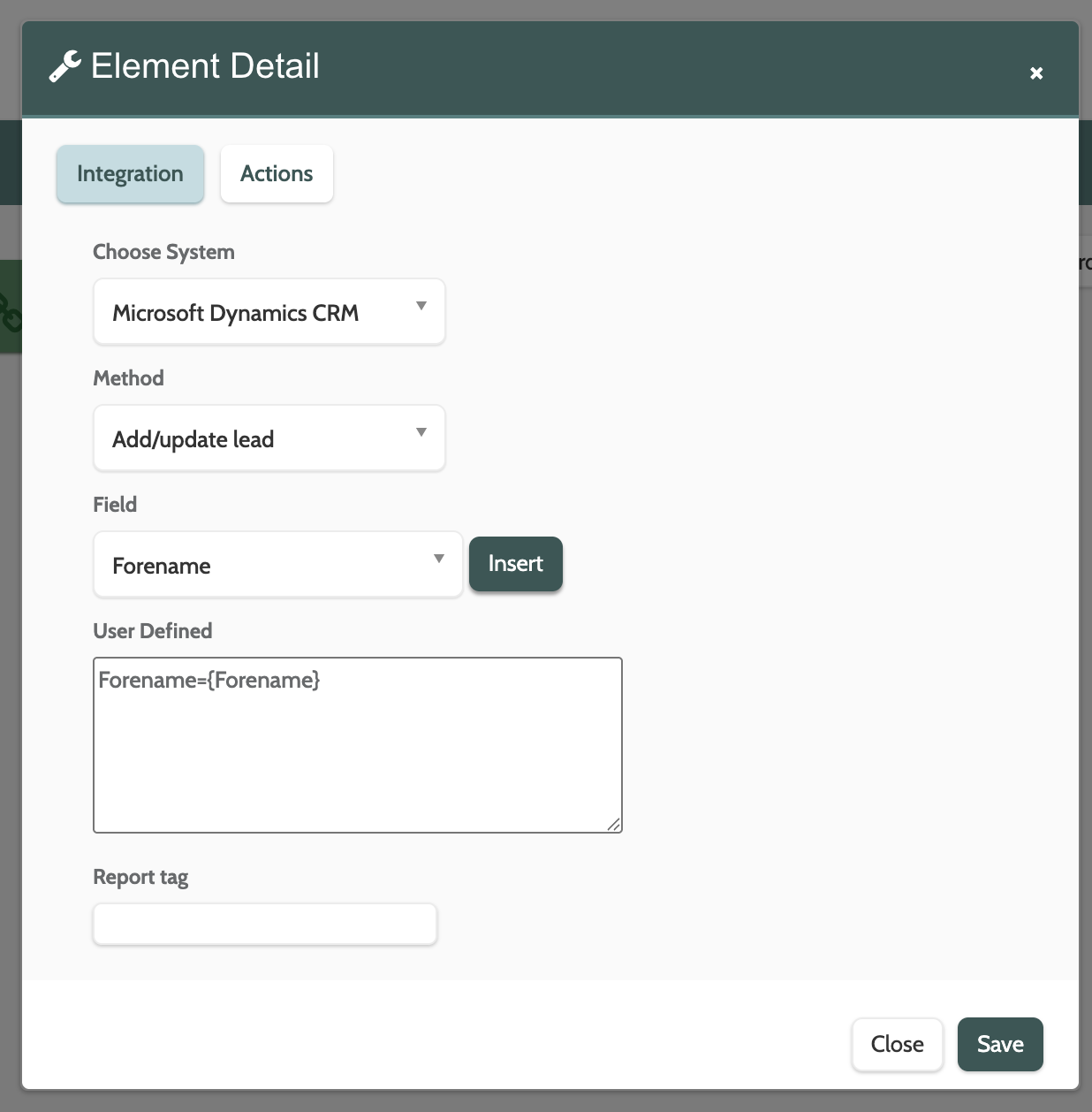 The Integration element will allow you to connect your automation flow to your Microsoft Dynamics CRM account, and update lead information between Flows and Microsoft Dynamics.
