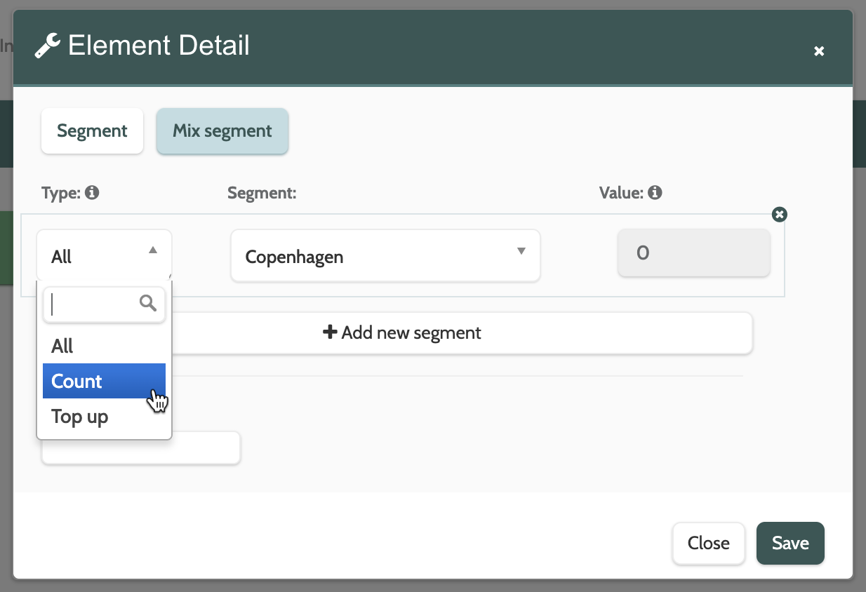 All will take all leads from the segments, Count will allow to to take a certain number, or value from each segment, and Top up will take a certain number of good leads from the segment to meet the number you specific in the Top up field - Under Segment, choose which segment to add to the element