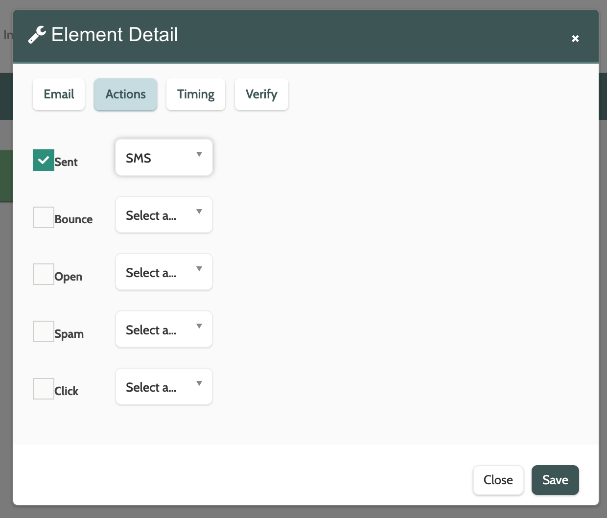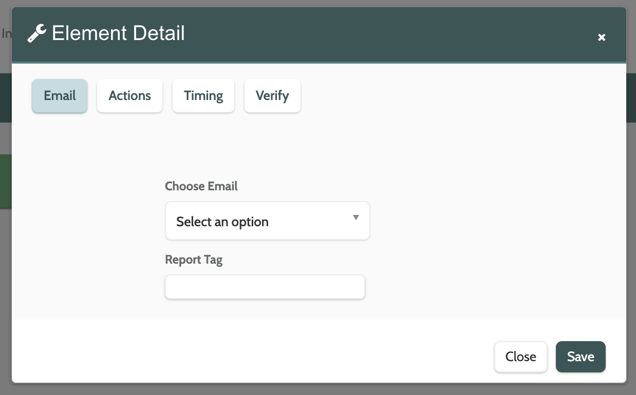 Each Activities element has the same options for the Actions, Timing, and Verify settings, so it will only be explained for the Email element.
