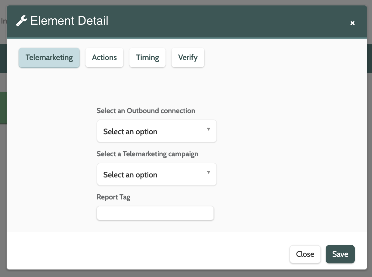 The Telemarketing element will allow you to add a lead to a telemarketing campaign to be called by an agent.