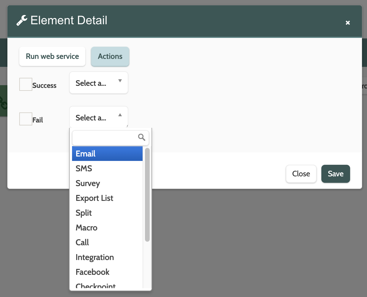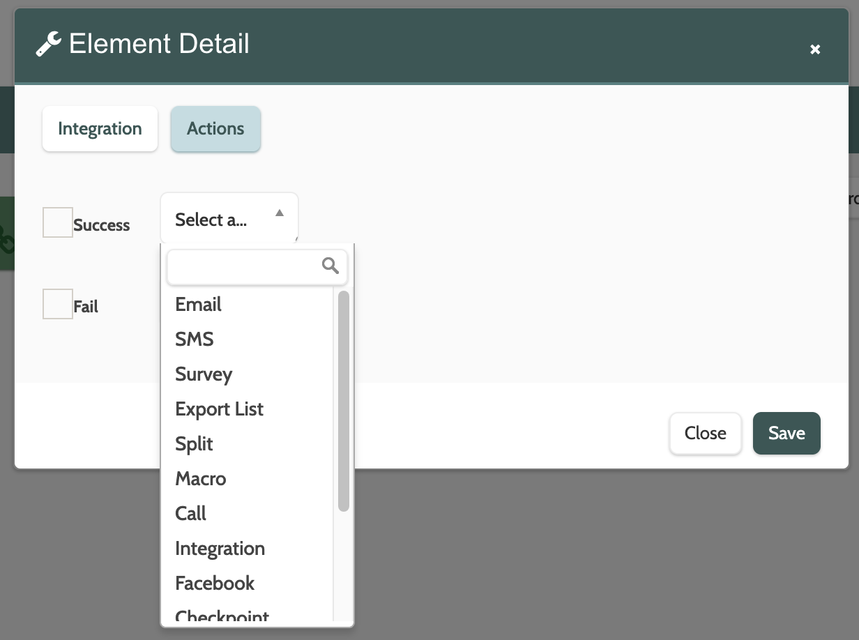 - Click Fail and choose an element from the menu that will be triggered by the lead not meeting the integration rules. The new element will then be added to the checkpoint element in the canvas by a red arrow.
