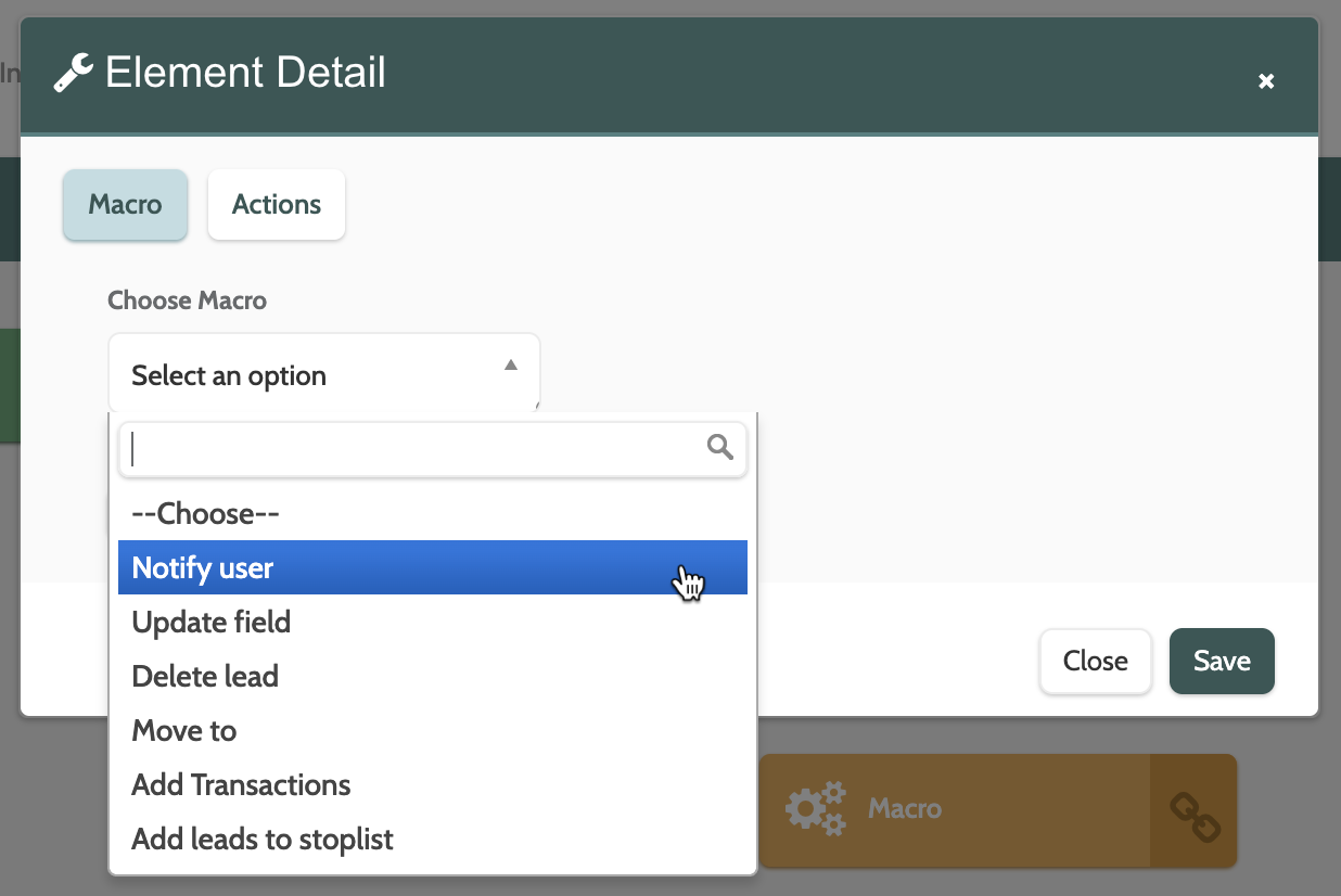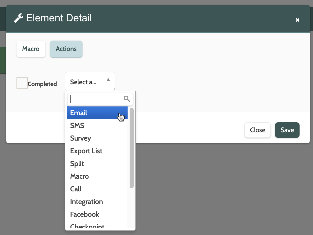 - Click Success and choose an element from the menu that will be triggered by the lead meeting the integration rules. The new element will then be added to the checkpoint element in the canvas by a green arrow