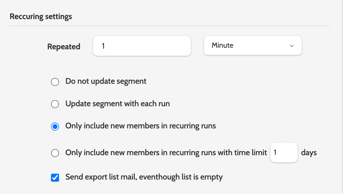 - Only include new members in recurring runs with time limit X days has the same function as the above setting, but with the option of a lock. If you choose a time limit of 2 days, for example, then new leads will only be added to the segment after 2 days