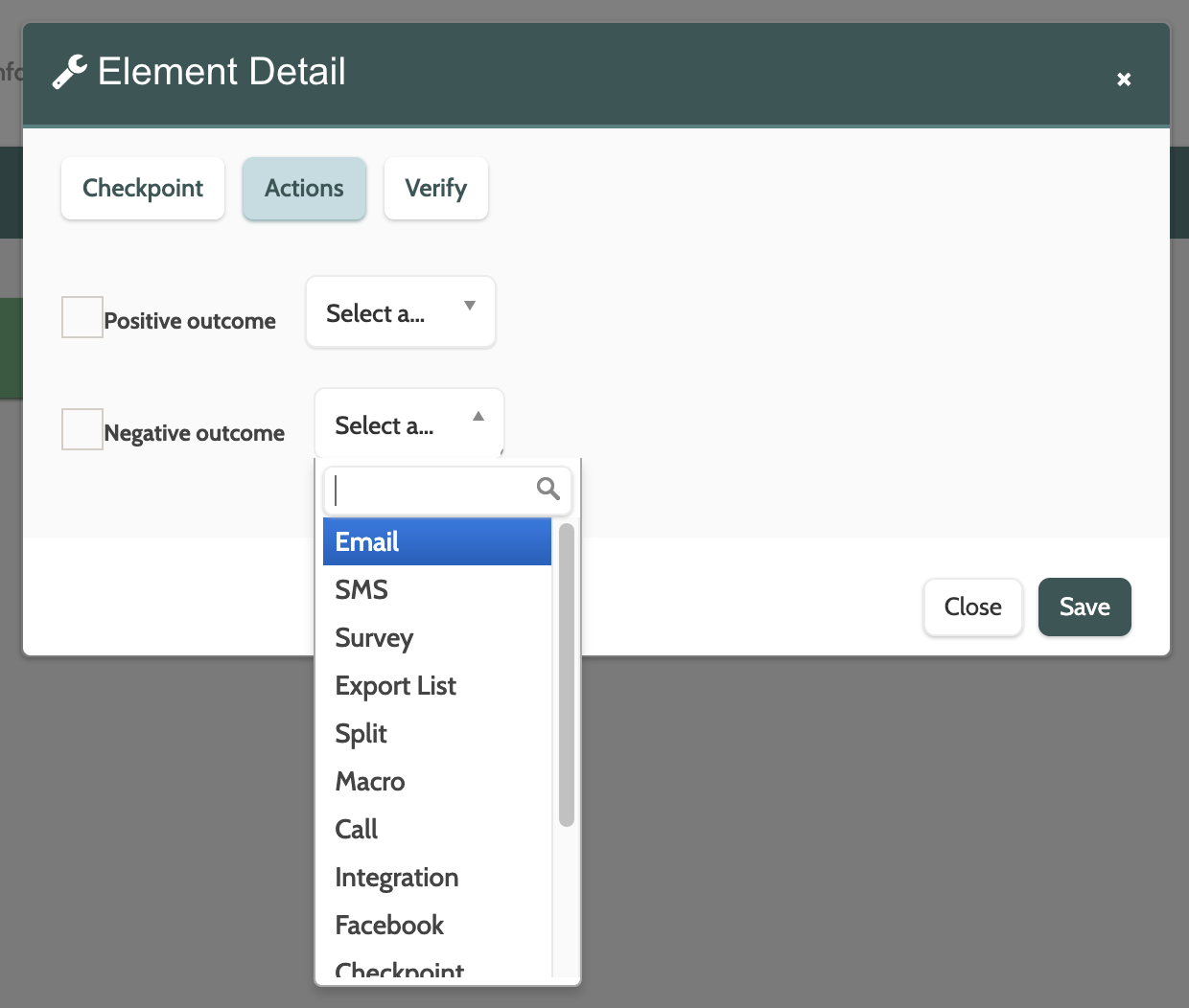 - Click Positive outcome and choose an element from the drop-down menu that will be triggered by the lead meeting the Checkpoint. The new element will then be added to the Checkpoint element in the canvas by a green arrow.