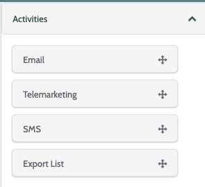 There are four different Activities elements: Email, Telemarketing, SMS, and Export List.