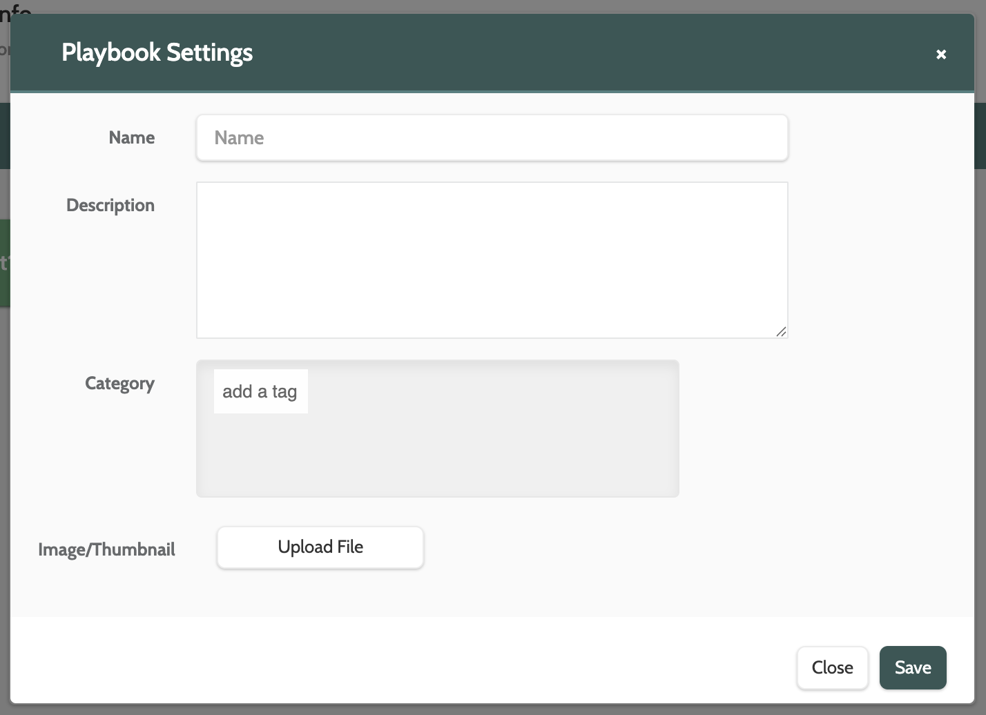 In the pop-up window, enter a name and description of your playbook, create a category tag to filter your playbook, and add an image file.