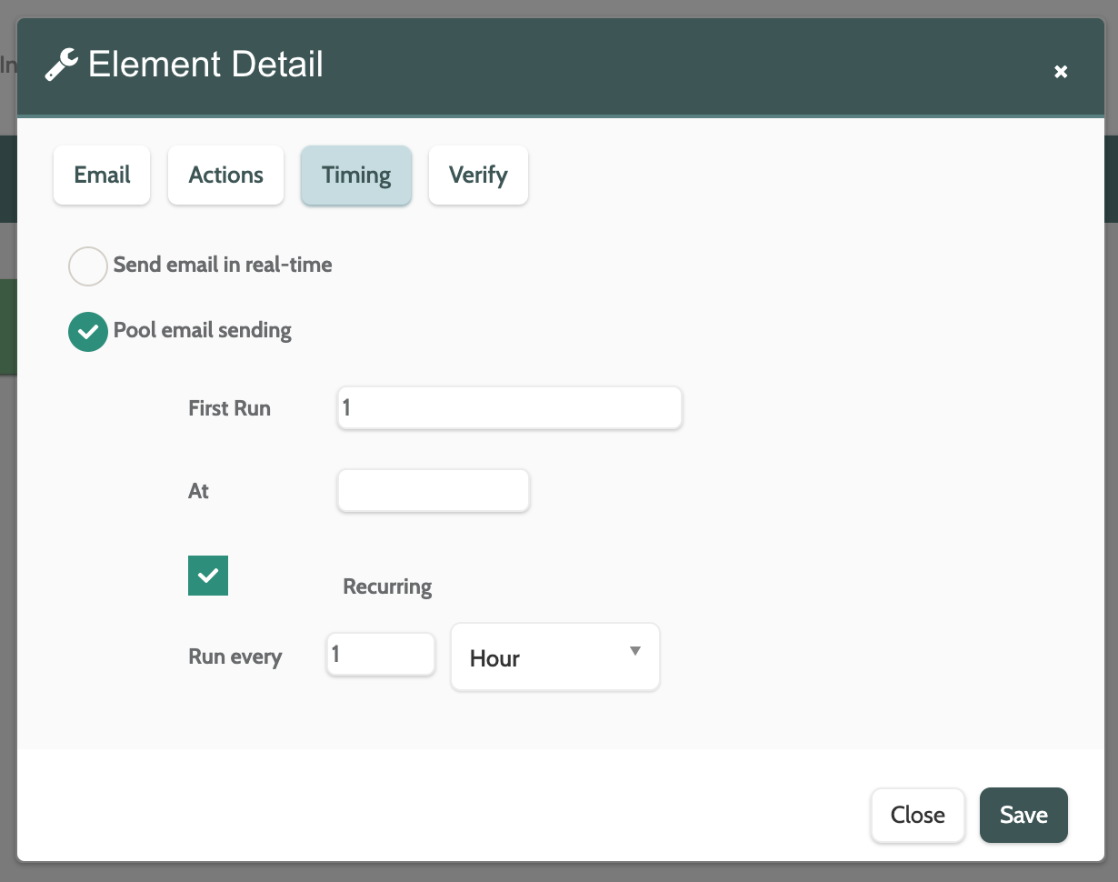 Click Pool Email to send the email in bulk to leads as they reach the email element. Enter the number of leads to receive the email in the First Run text field, and enter a time (HH:MM) in the At text field.