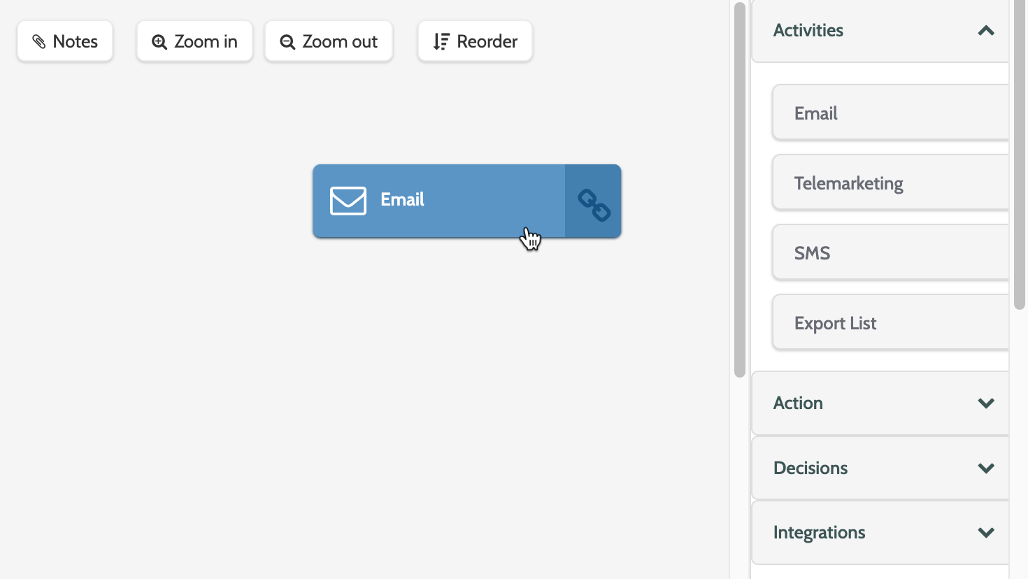 There are also several options for the canvas: click Notes to add a note to your automation, zoom in or out, and click re-order to re-order each element.