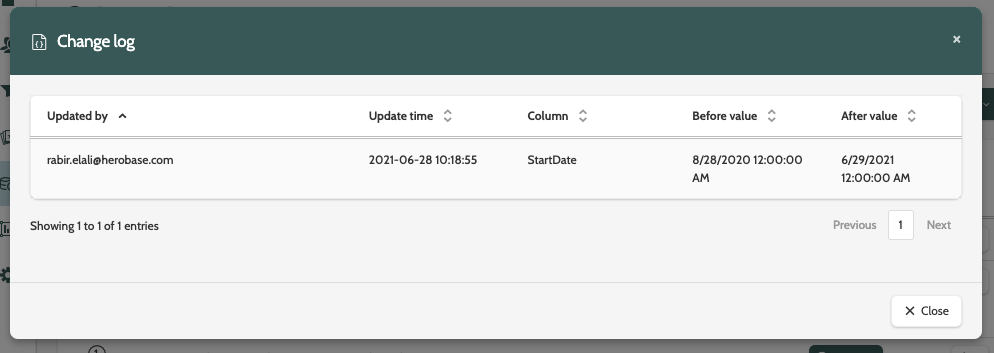 Click Change log to view all historical changes made to the automation, including the before and after value, and which user made the change.